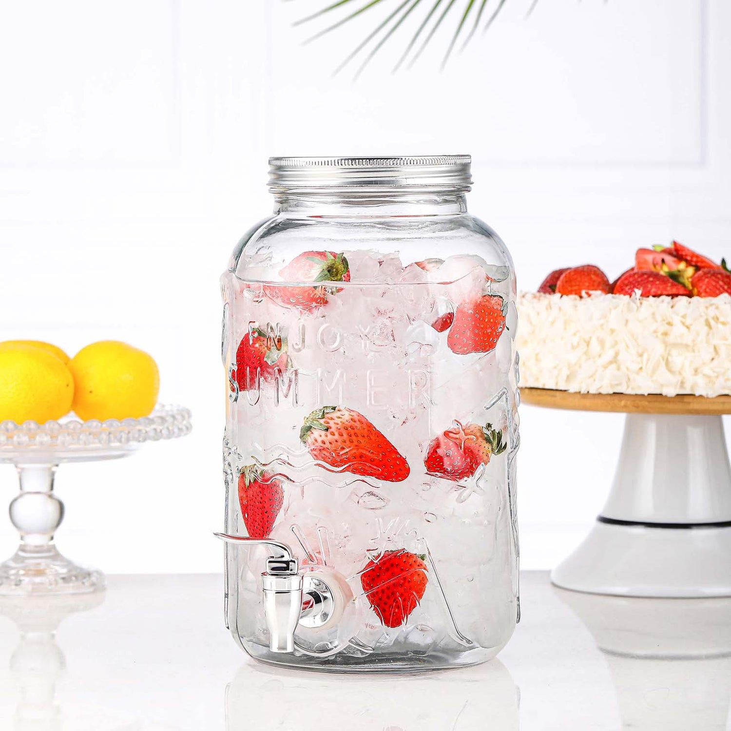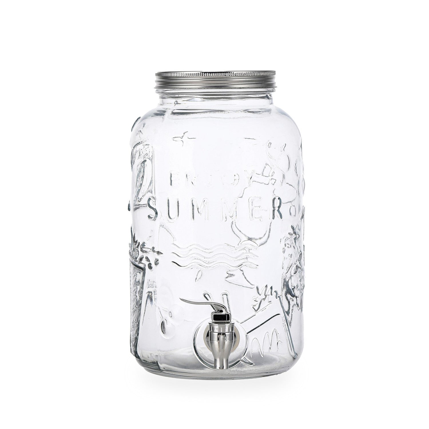 Il Barile in cristallo Versa da 4 litri è ideale per servire acqua aromatizzata, succhi, cocktail, tè freddo e rinfreschi durante feste, cene, buffet o giornate all’aperto. Il design trasparente con decorazioni in rilievo e la scritta Enjoy Summer aggiungono un tocco fresco e moderno a qualsiasi tavola.