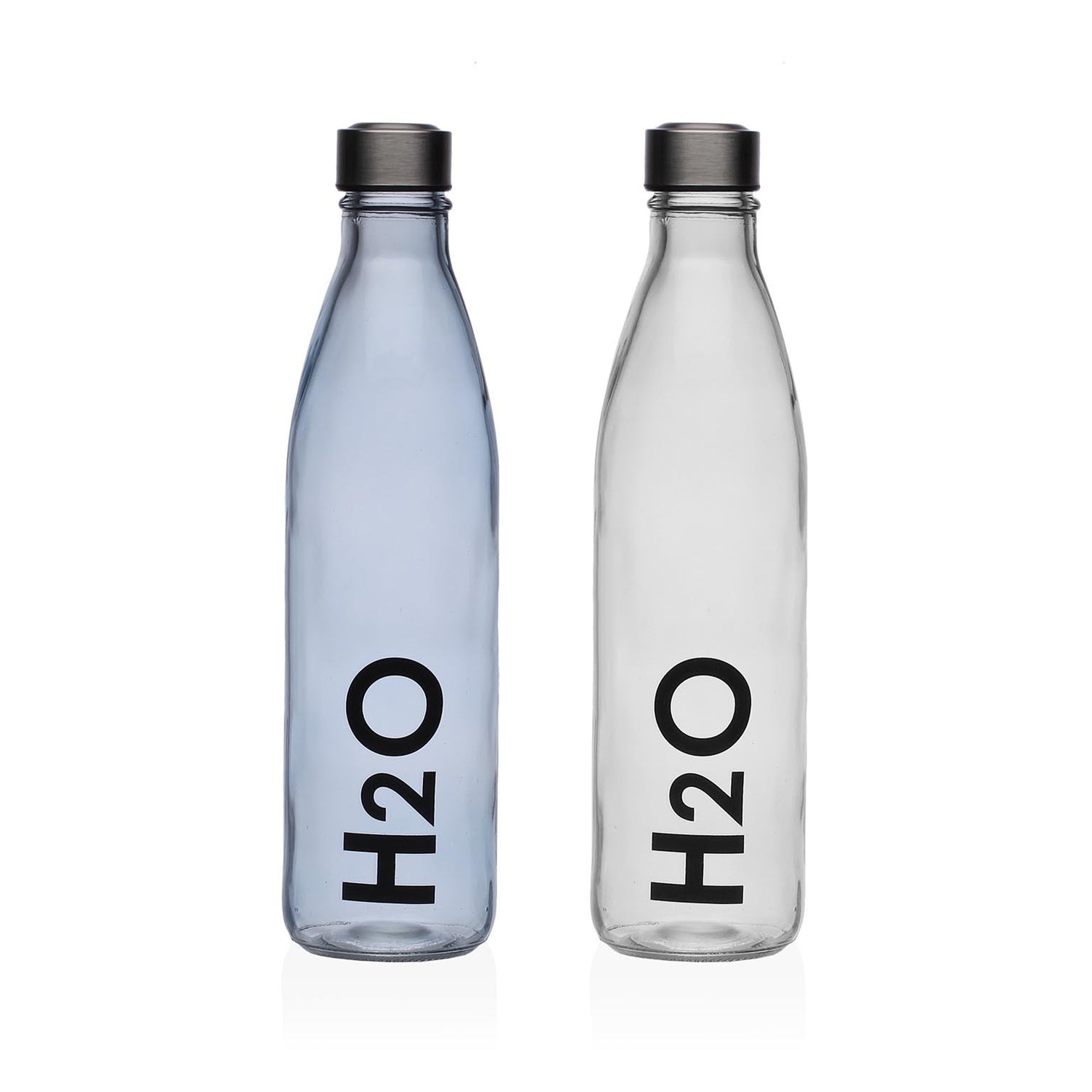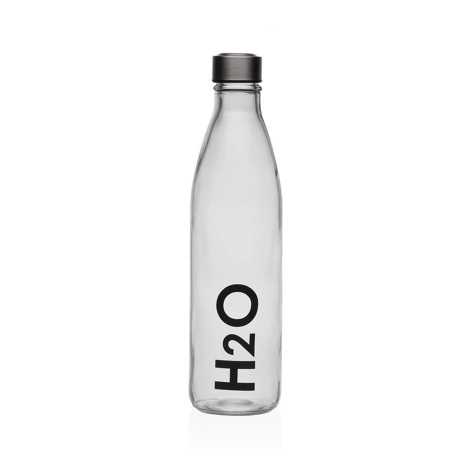 Realizzata in vetro trasparente resistente, presenta la scritta H2O in nero per un look pulito e contemporaneo. Il tappo in alluminio assicura una chiusura ermetica, ideale per conservare acqua e bevande fresche.