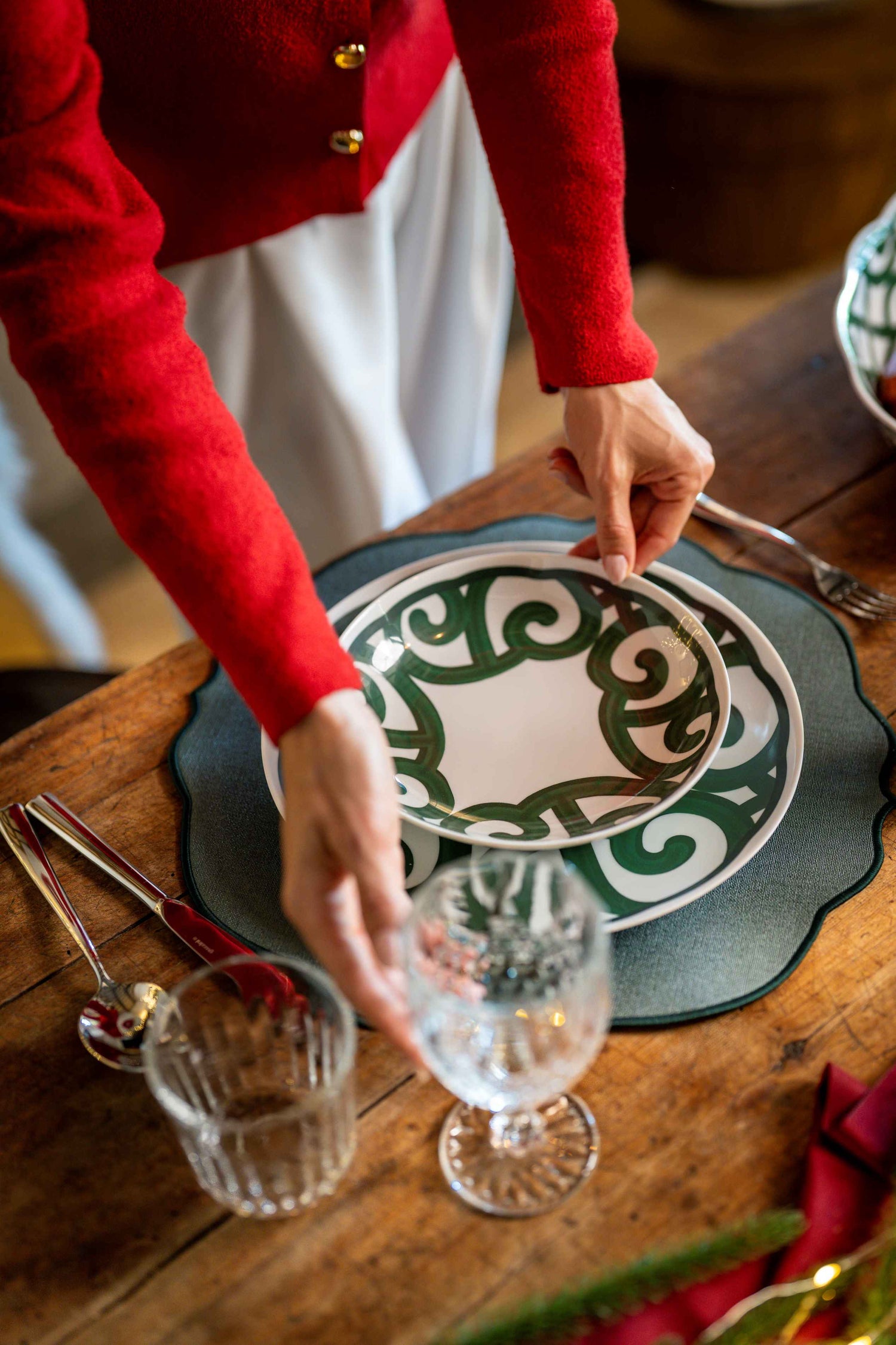 🎨 Design elegante e festivo – decoro verde su fondo bianco per una tavola sobria e raffinata
