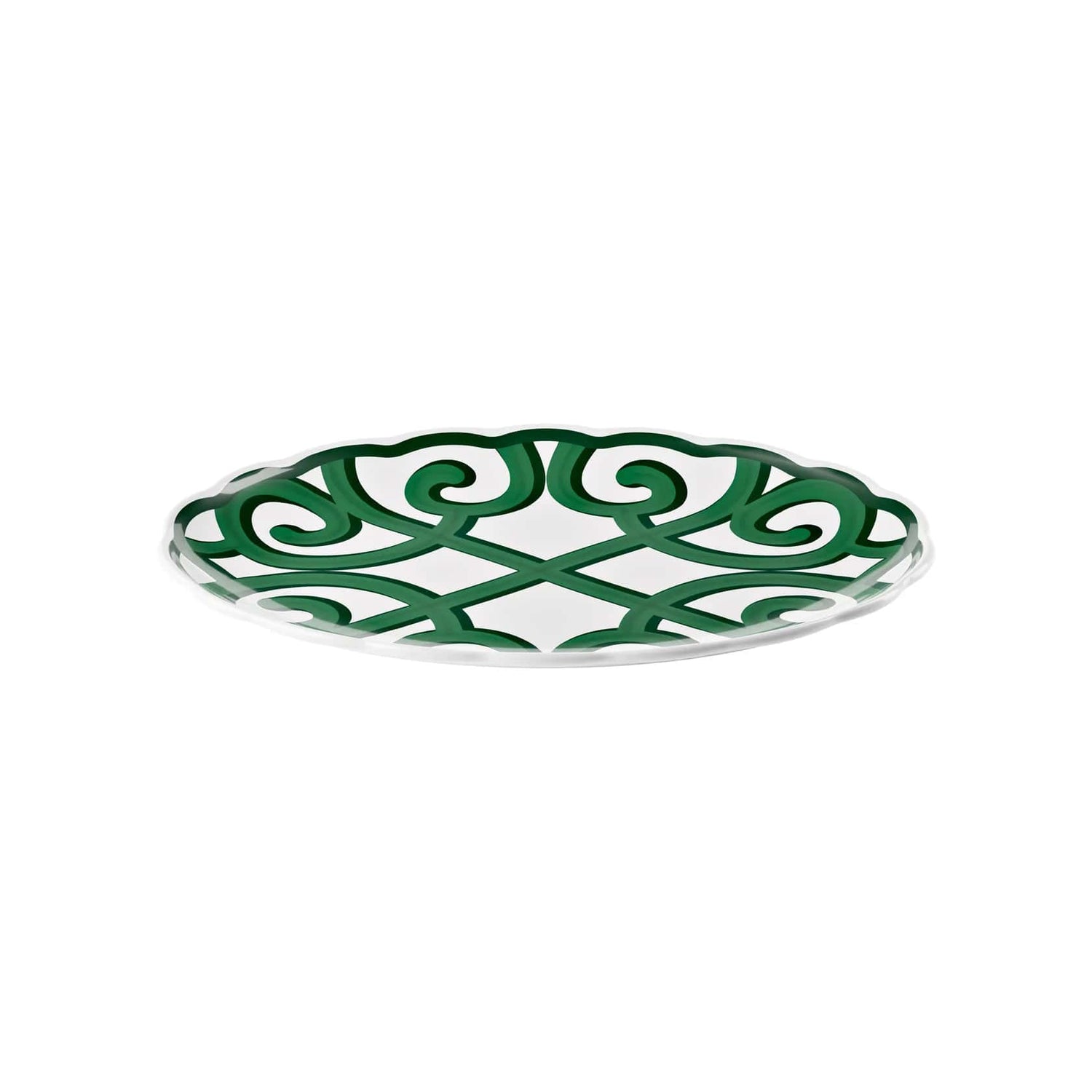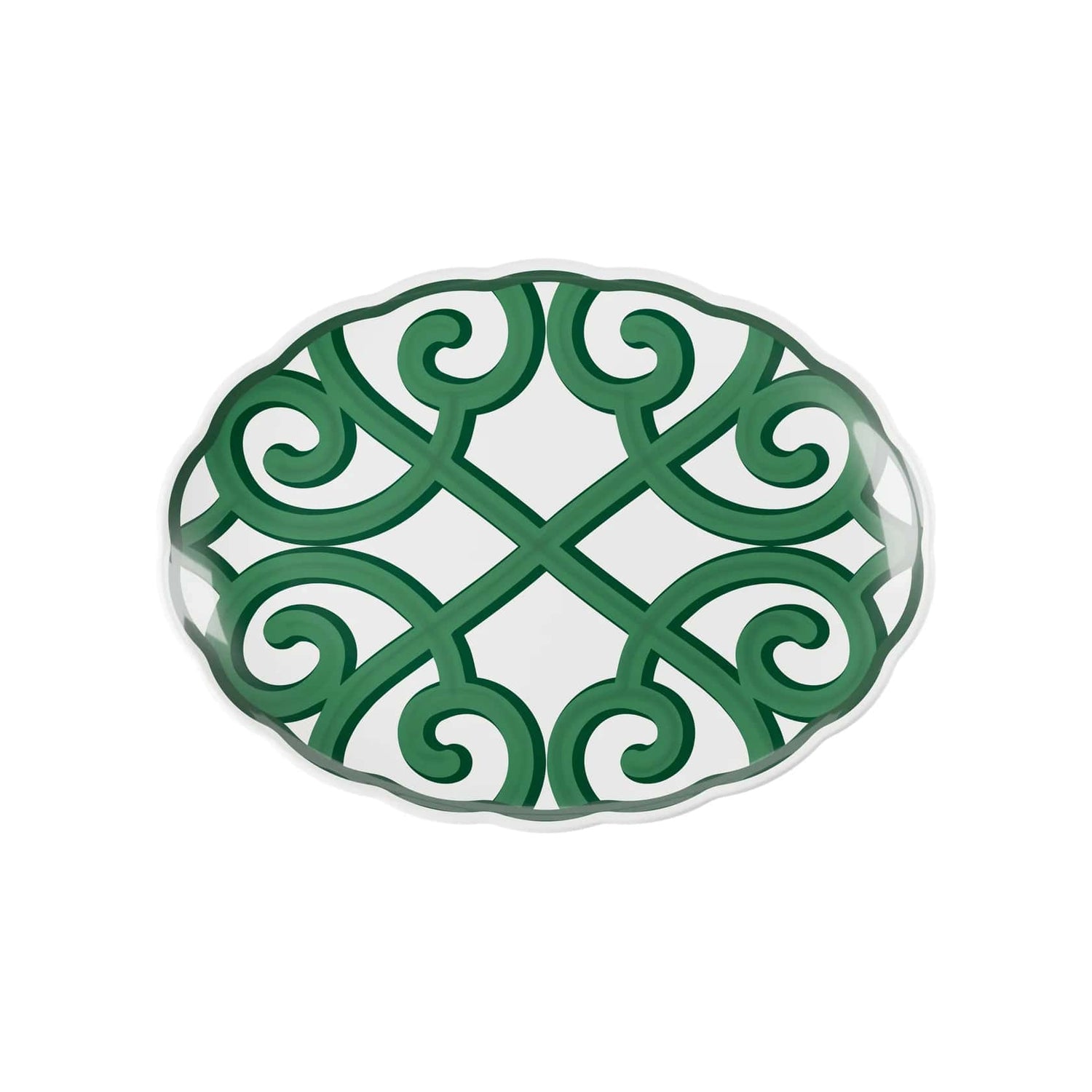 Raffinatezza e praticità si incontrano nel Vassoio Ovale Grande Guzzini Harmonia, un’elegante creazione in melamina di alta qualità con decori verdi su fondo bianco, pensata per portare stile e armonia sulla tavola delle feste.