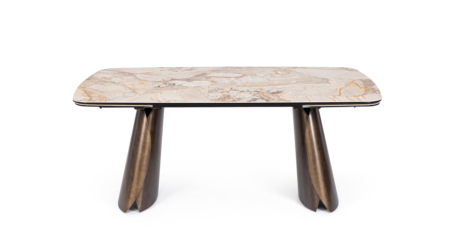 Grazie alle prolunghe indipendenti, il tavolo passa da 180 cm a 220 o 260 cm, adattandosi facilmente a diverse esigenze di spazio. Le gambe in acciaio effetto rame spazzolato, abbinate al supporto verniciato a polvere epossidica, completano il look con un tocco industrial chic.