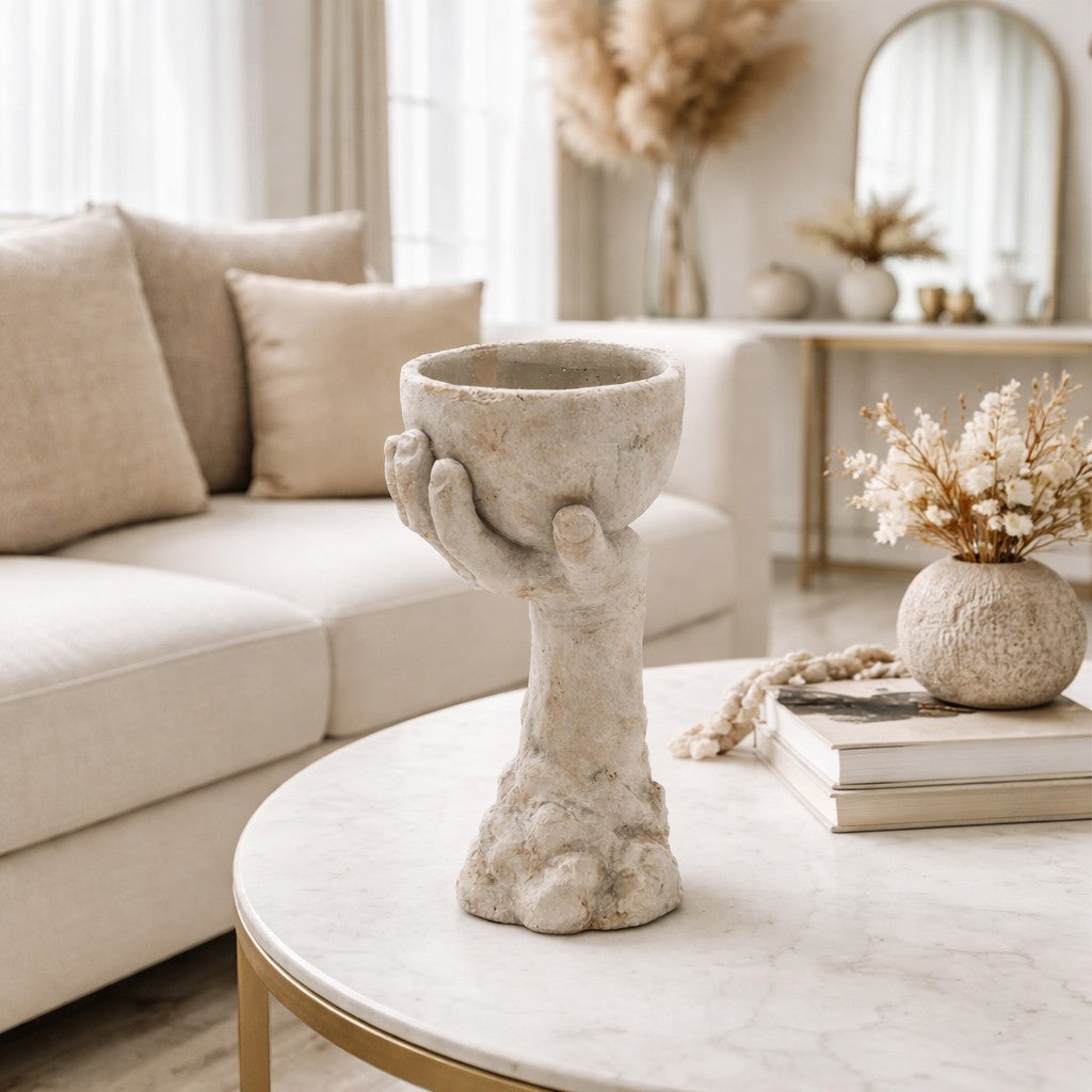 l vaso Graal in cemento firmato EDG Enzo De Gasperi è un complemento d’arredo scultoreo dal forte impatto estetico. La particolare forma a mano che sorregge una coppa richiama simbologie classiche e artistiche, trasformando un semplice contenitore in un elemento decorativo di grande personalità.