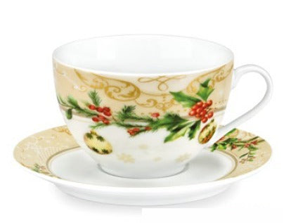 Crafted from decorated porcelain , these mugs feature elegant Christmas motifs with holly, red berries, and gold accents. Perfect for enjoying tea, coffee, or hot chocolate during the holidays, bringing style and tradition to your Christmas table.