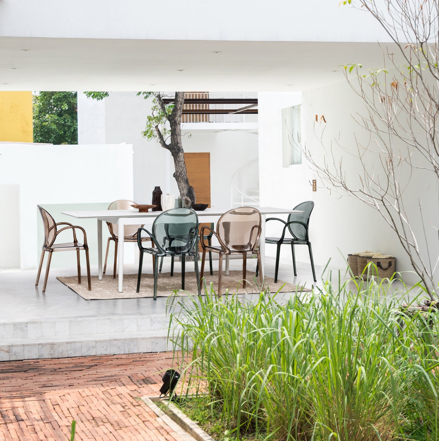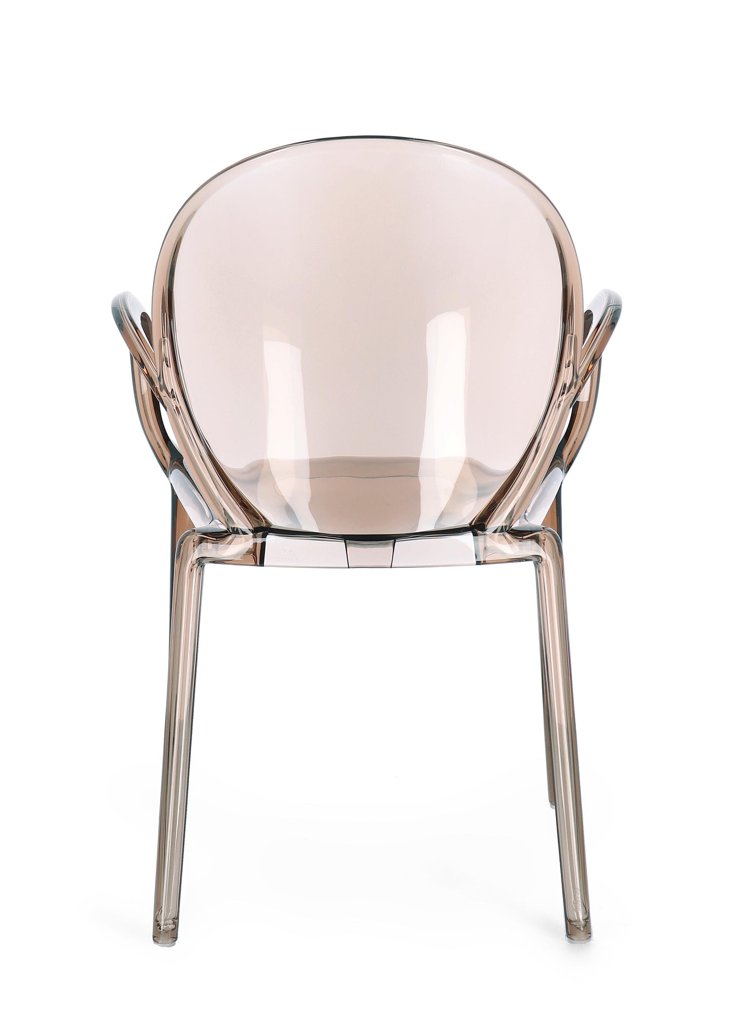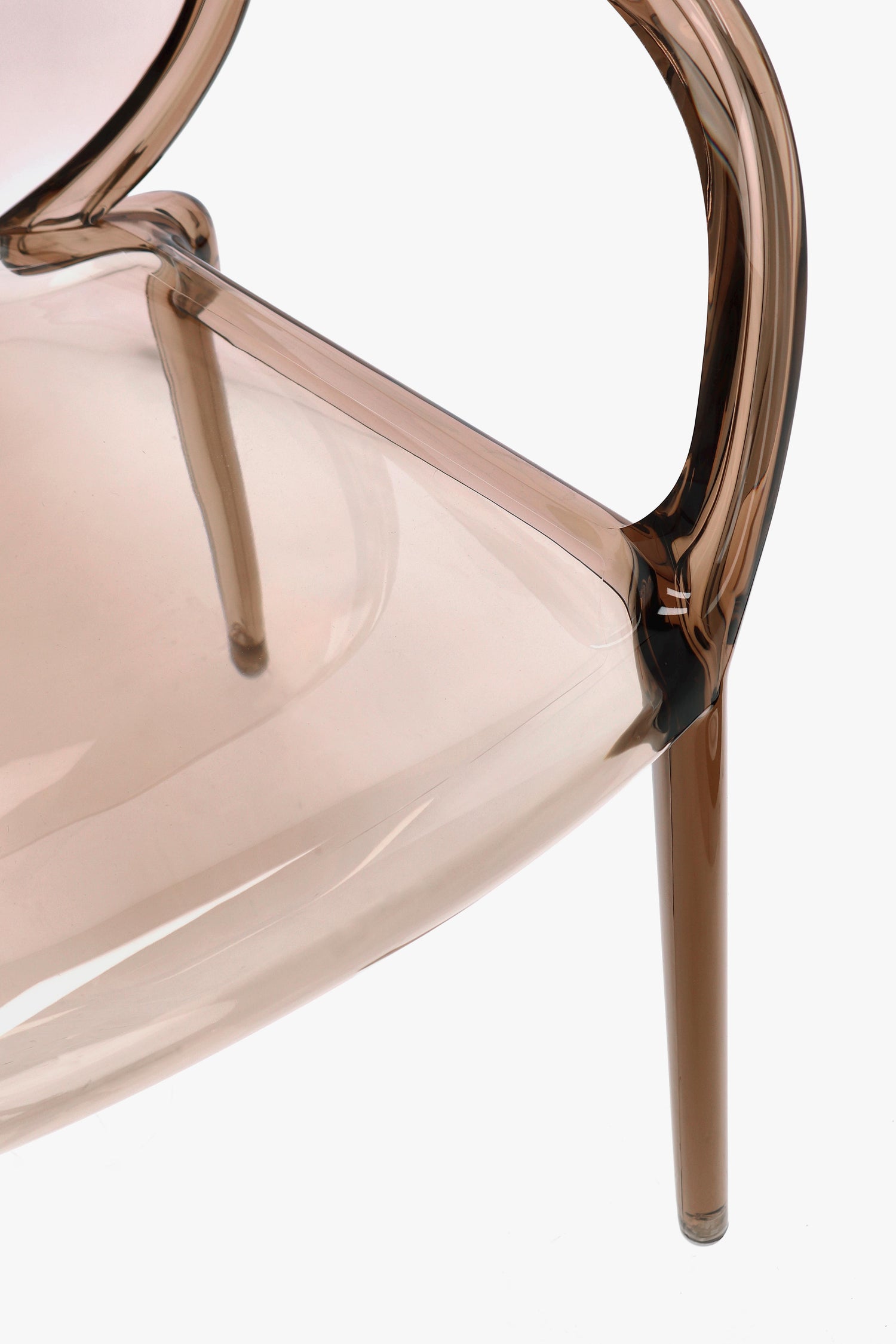 La trasparenza del materiale, unita alla sfumatura calda del coffee, valorizza gli spazi senza appesantirli. I braccioli integrati e la seduta ergonomica offrono comfort, mentre l’architettura impilabile ne esalta la versatilità, anche in ambienti contract o hospitality.