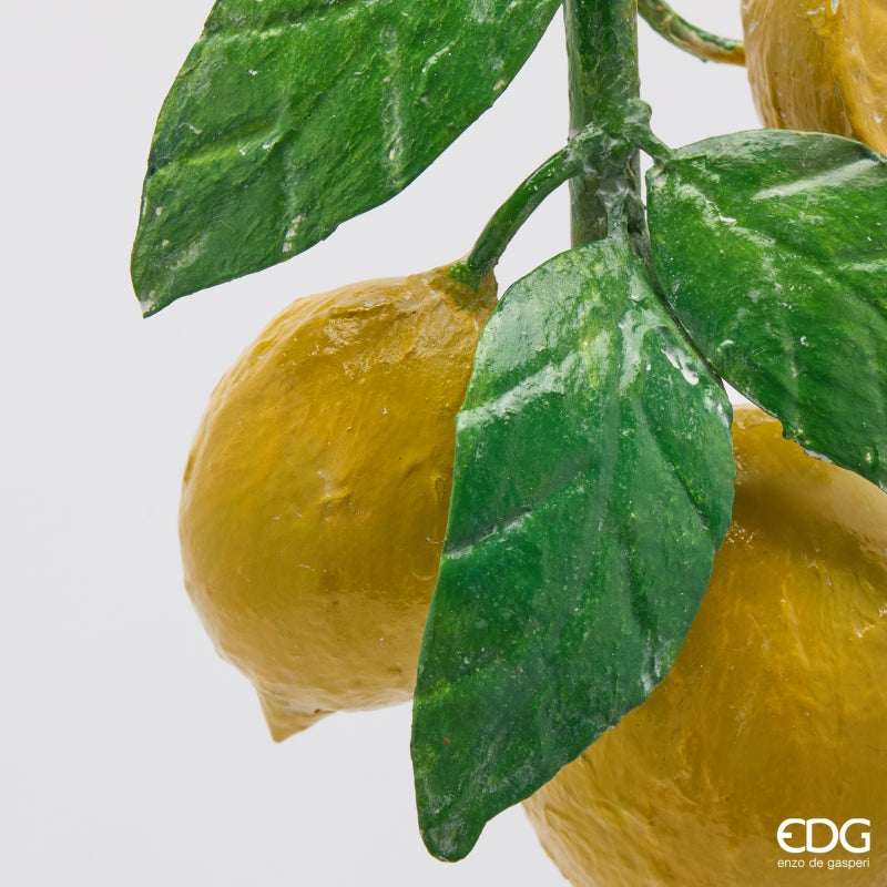 Decorazione sospesa dallo stile fresco e mediterraneo, firmata EDG Enzo De Gasperi. Composta da limoni gialli con foglie verdi e fiore bianco decorativo, è realizzata in metallo e ferro con finitura materica effetto artigianale.
