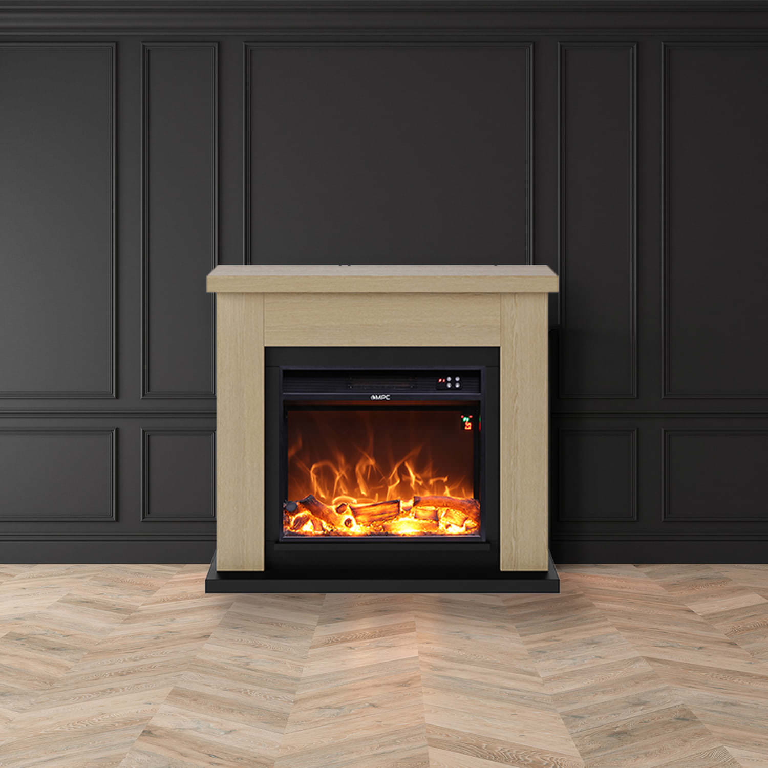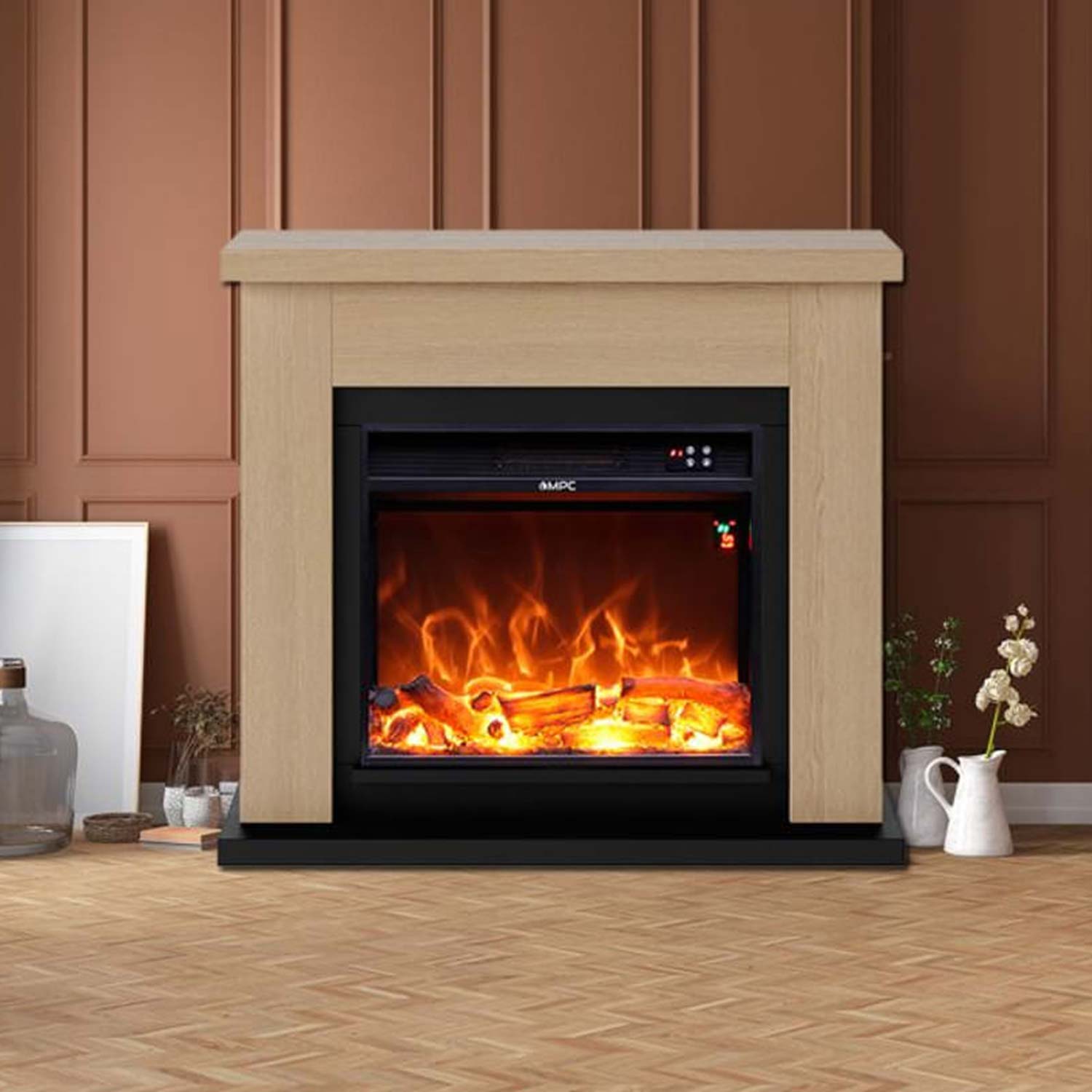 Caminetto elettrico completo per interni, composto da cornice con impiallacciatura in legno di rovere naturale e braciere elettrico della potenza di 1500W. Facile la sua installazione in qualsiasi ambiente e la manutenzione nel tempo. Il caminetto elettrico in rovere è fornito di telecomando che controlla tutte le funzioni del camino elettrico.