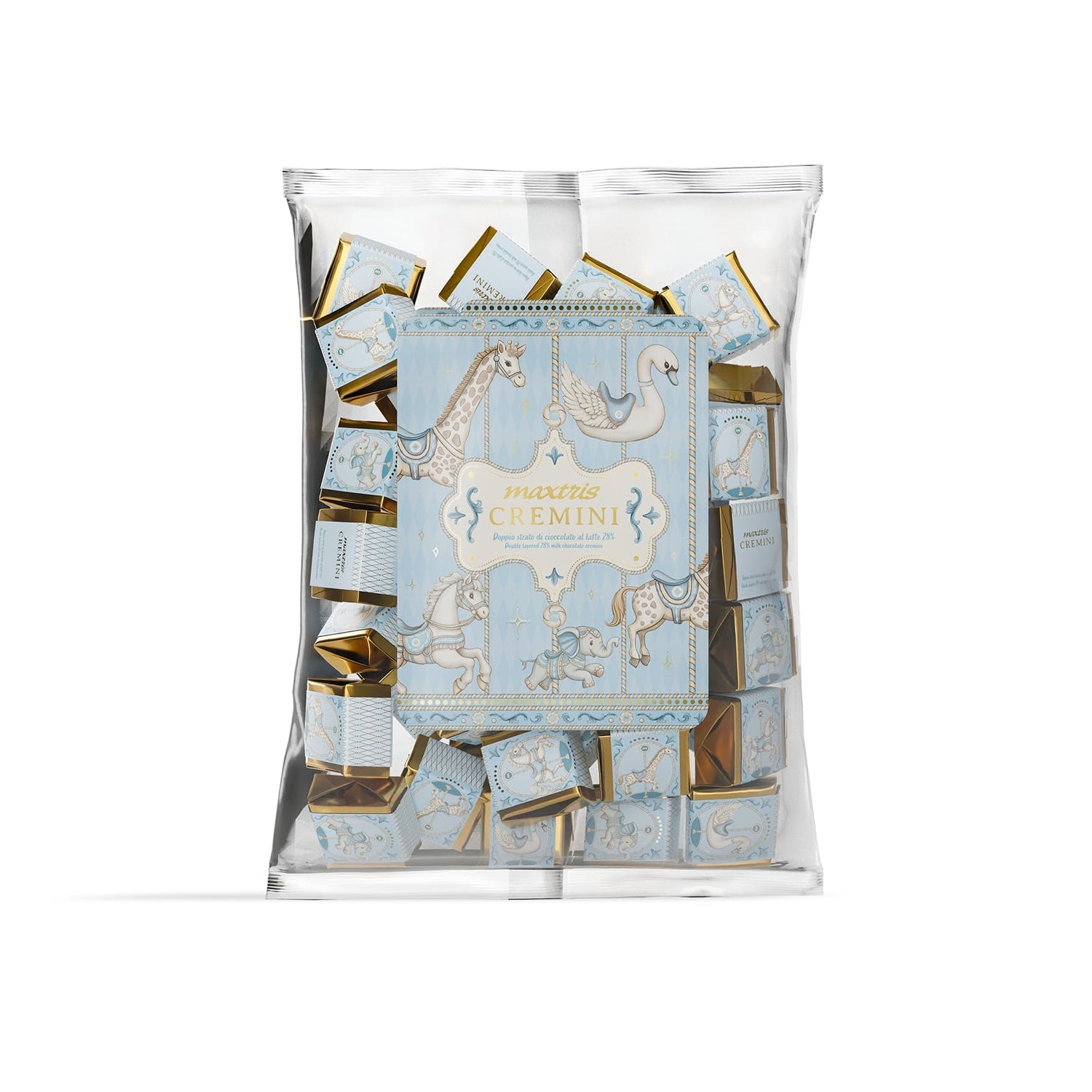 La Busta Maxtris Baby Cremino Triplo Strato Celeste contiene 500 g di deliziosi cremini, perfetti per celebrare nascita, battesimo o baby shower. Ogni cremino è realizzato con un triplo strato di cioccolato al latte, arricchito da pasta di nocciole italiane e pasta di mandorle, per una consistenza morbida e un gusto ricco e armonioso.