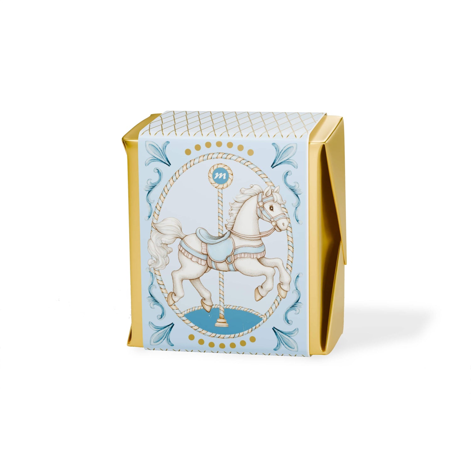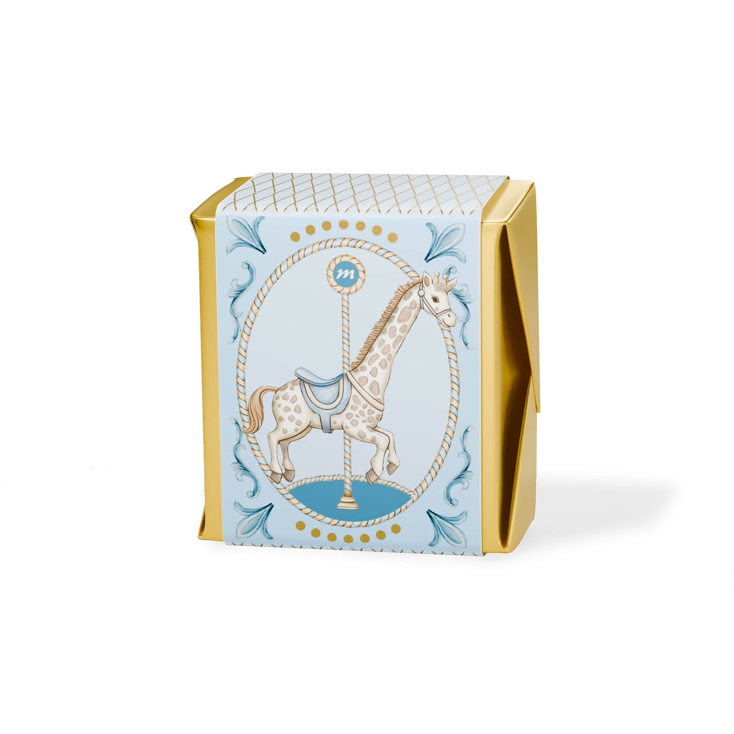 Il prodotto è confezionato in una pratica busta trasparente, impreziosita da un elegante cartoncino illustrato a tema giostrina in tonalità celeste, ideale per allestire tavoli confettata o per creare bomboniere dolci e raffinate.