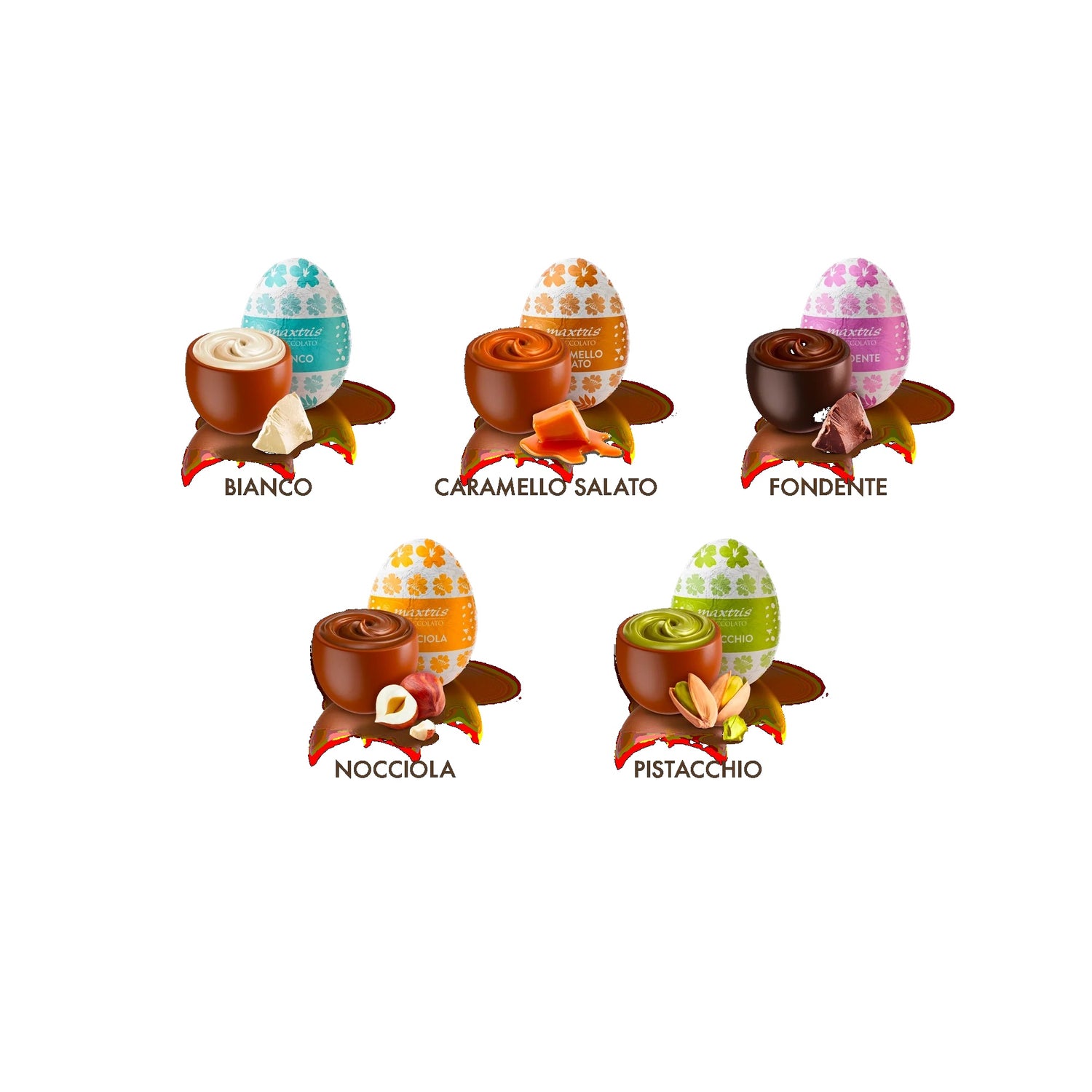 5 gusti assortiti: bianco, fondente, caramello salato, nocciola, pistacchio