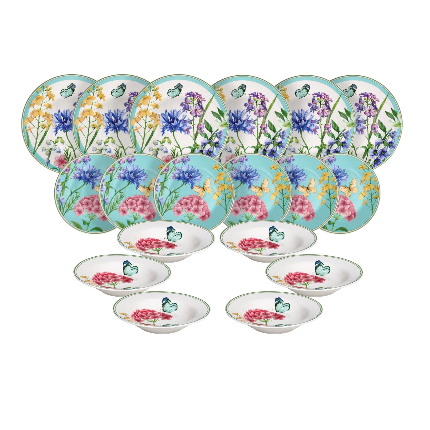 Il servizio è composto da 18 pezzi, pensato per 6 persone, e include piatti piani, piatti fondi e piatti dessert per una tavola completa e coordinata.