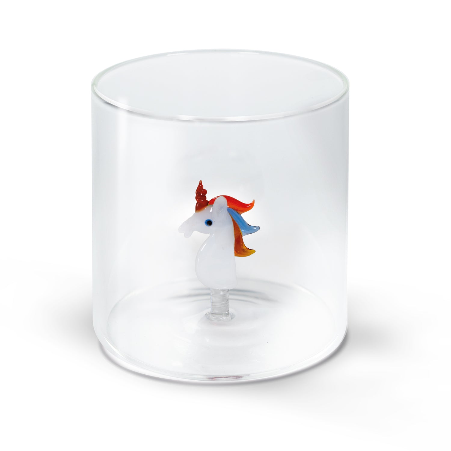 All’interno del bicchiere è presente una scultura tridimensionale di unicorno realizzata artigianalmente in vetro soffiato, con dettagli colorati e finiture curate. Ogni soggetto è modellato a mano, rendendo ogni bicchiere un pezzo unico, con leggere differenze che ne esaltano l’artigianalità.
