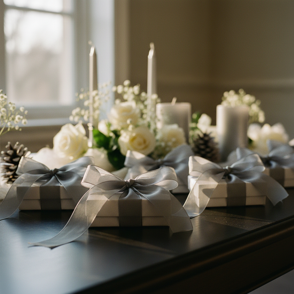 Perfetto per confezionare bomboniere, pacchi regalo e composizioni floreali su terrazze, verande e giardini con uno stile elegante e luminoso. Ideale per matrimoni invernali, feste di Natale e ricevimenti dove il colore argento crea allestimenti raffinati e di grande impatto visivo. Scelto da fioristi, hotel boutique, resort e location eventi per legature, bouquet e allestimenti natalizi coordinati in palette argento e bianco.