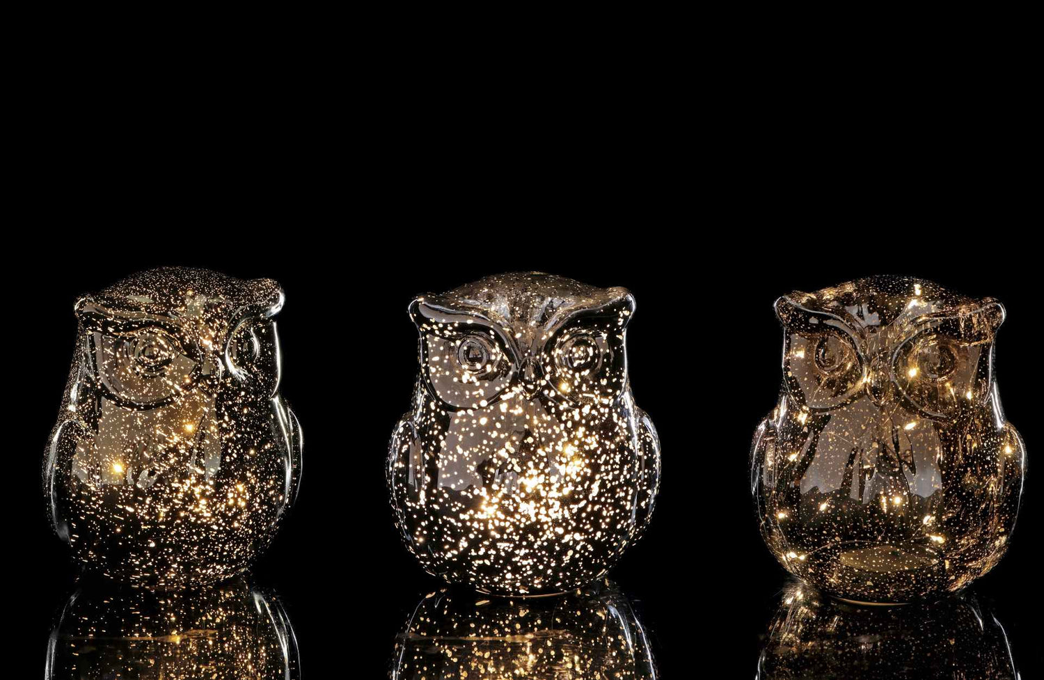 Regalo Italiano Lampada Gufo Natale Vetro Ass. con 15 Led D 16 Cm H 18 Cm Oro 1 Pz