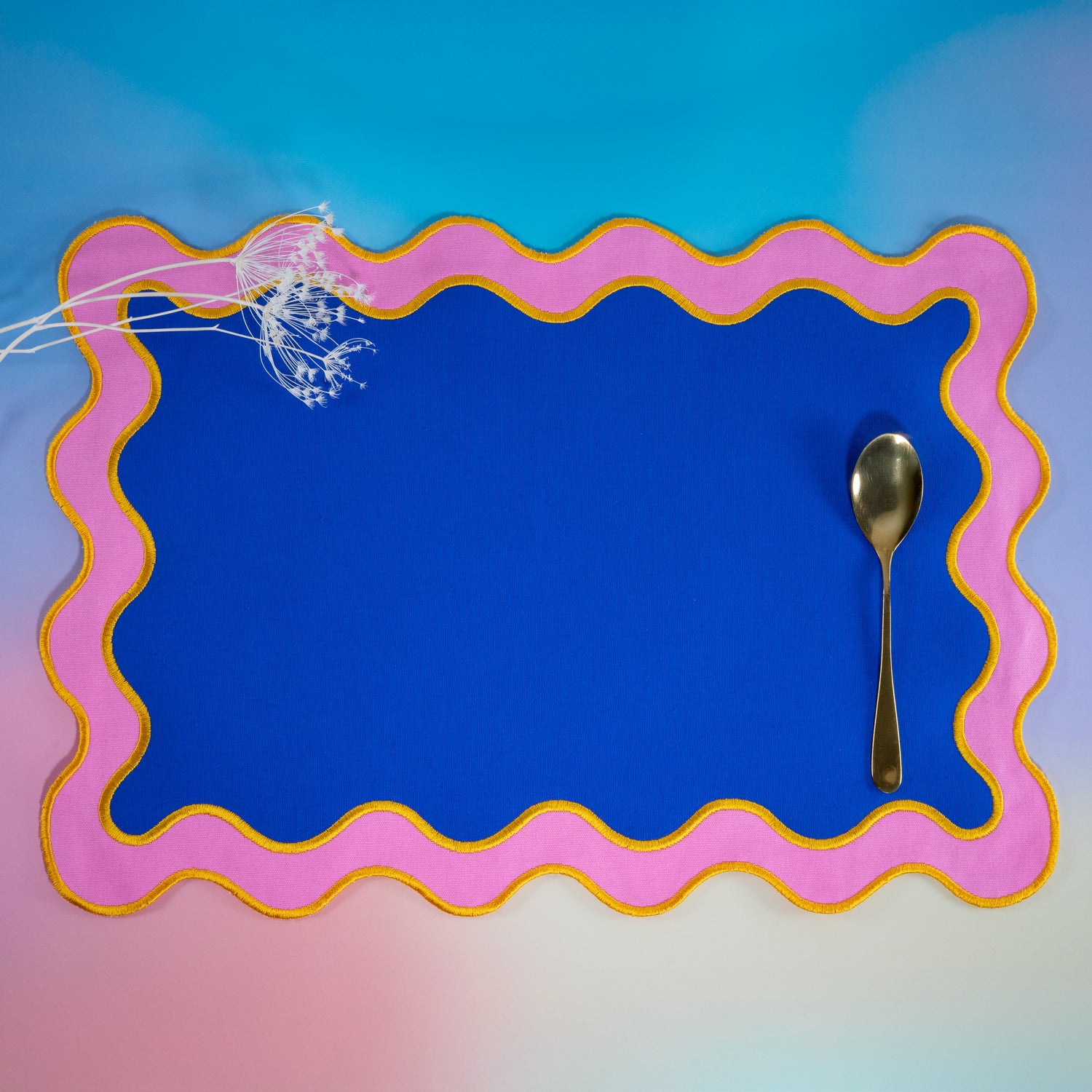 Realizzate in cotone di qualità, queste tovagliette risultano morbide, resistenti e riutilizzabili, ideali per l’uso quotidiano così come per occasioni informali, brunch, aperitivi o cene tra amici. L’abbinamento tra il blu intenso e il rosa delicato, rifinito da profili color senape, dona un equilibrio cromatico moderno e sofisticato, perfetto per ambienti contemporanei e creativi.